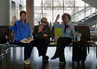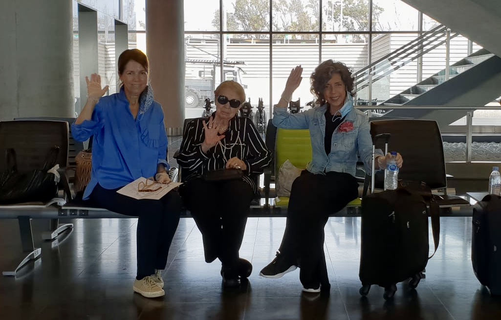 Carmita, Macamen y Chabela envían un saludo a Chicho en la escala en Los Rodeos (Tenerife), en vuelo a Madrid. Carlichi es el fotógrafo