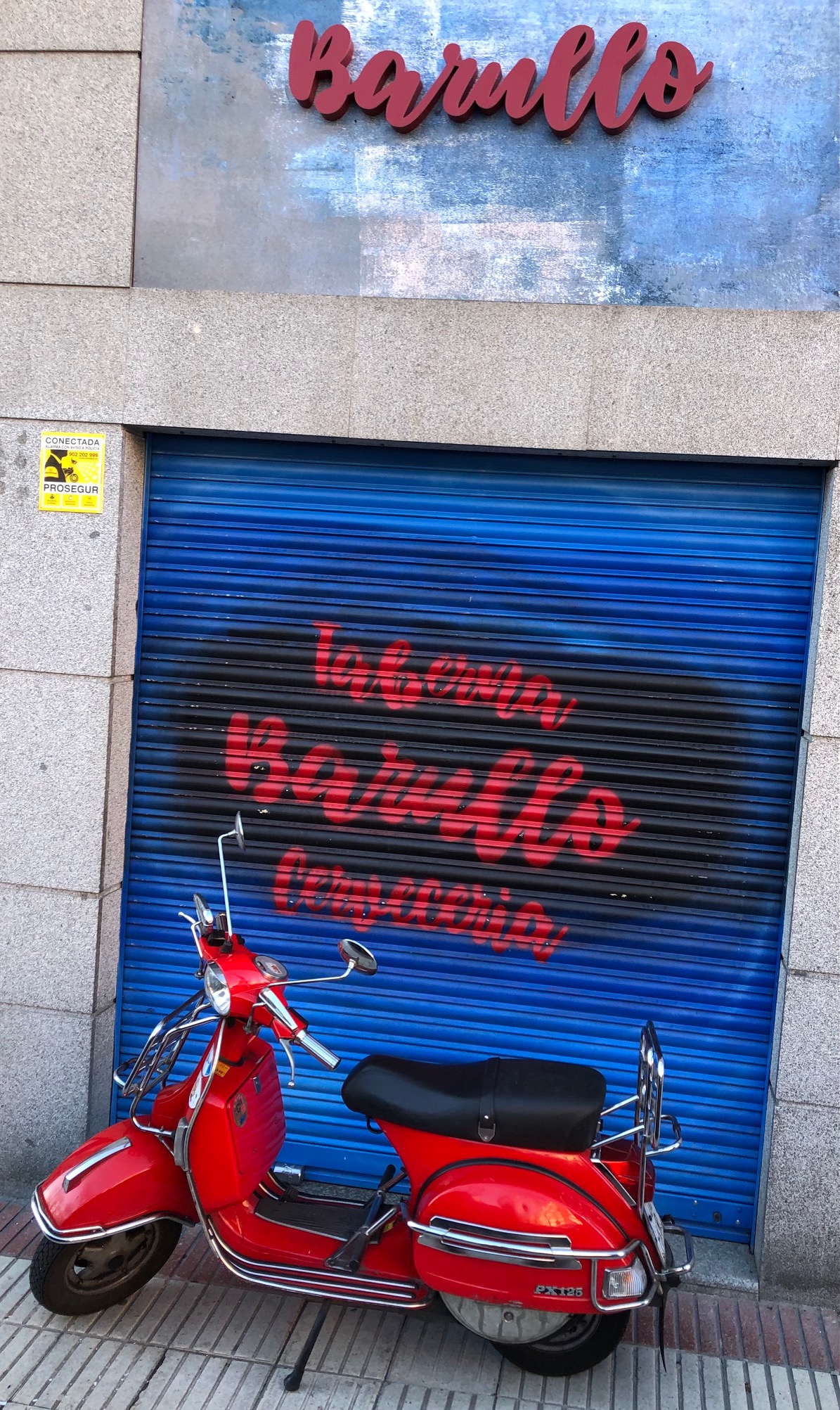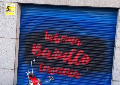 Imagen de febrero de 2021 de la Vespa de Chicho en la puerta de Taberna Barullo (Madrid), su último lugar de trabajo en la hostelería