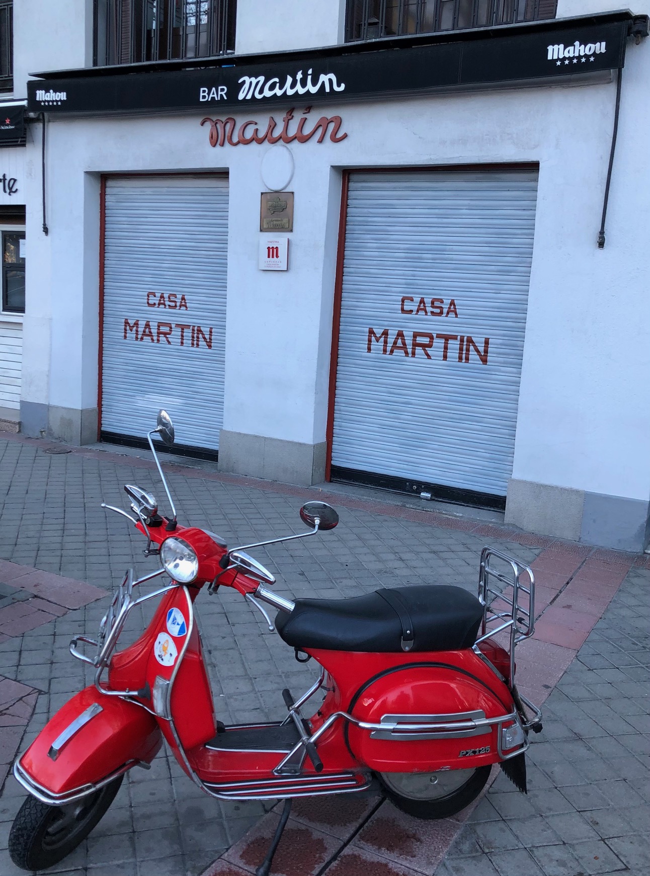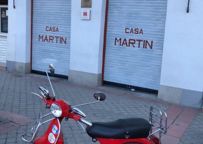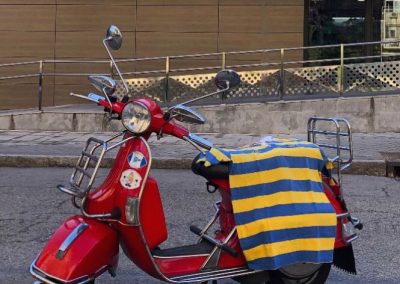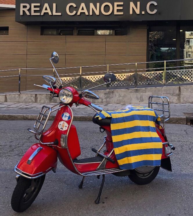 La Vespa y la camiseta de Chicho, delante del edificio del Real Canoe NC, sede del Canoe Rugby. Imagen tomada en febrero 2021
